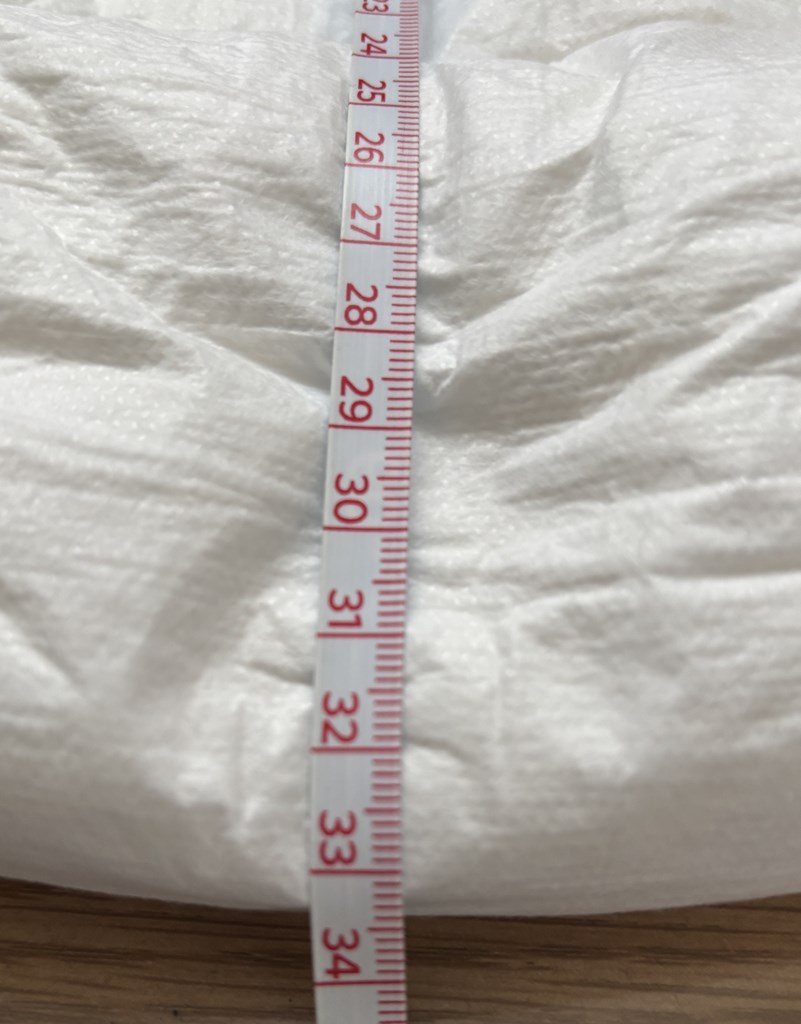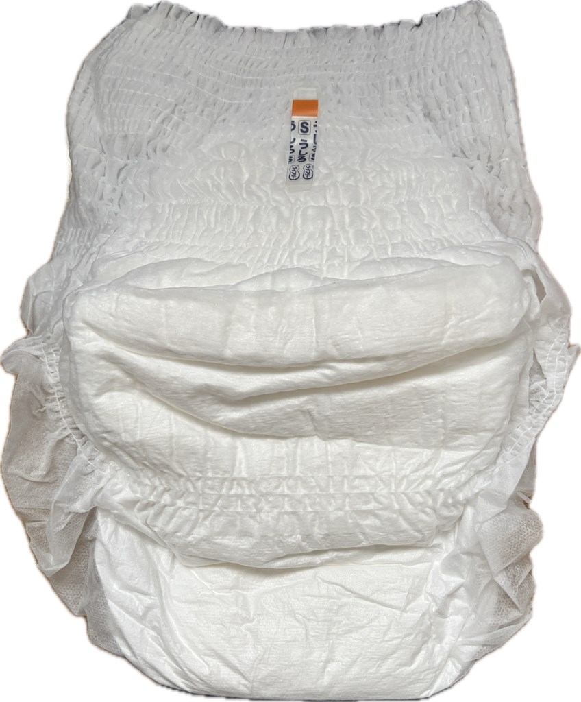 薄いタイプのおむつではないため若干のごわつきは感じますが、全体的に形がすっきりしています。長時間の使用を前提とした設計のため、肌への負担も少なく、長く装着していても快適に過ごせそうです。